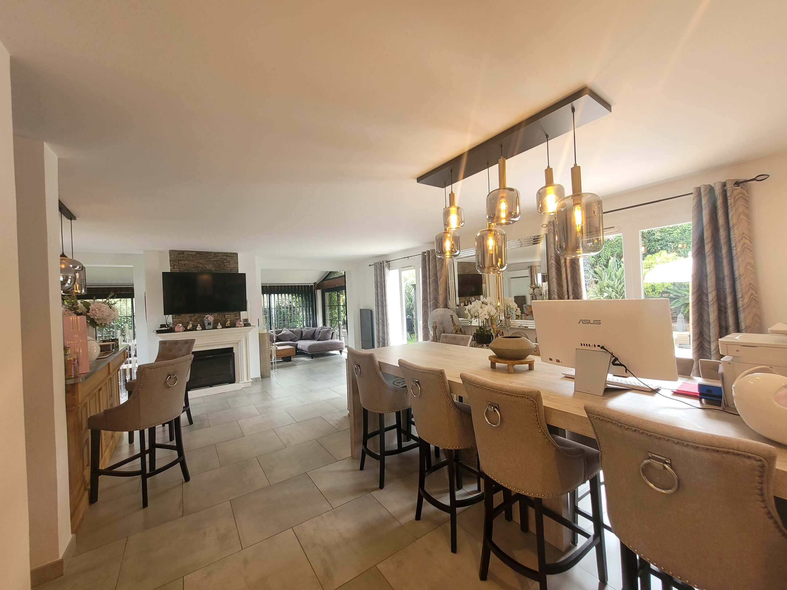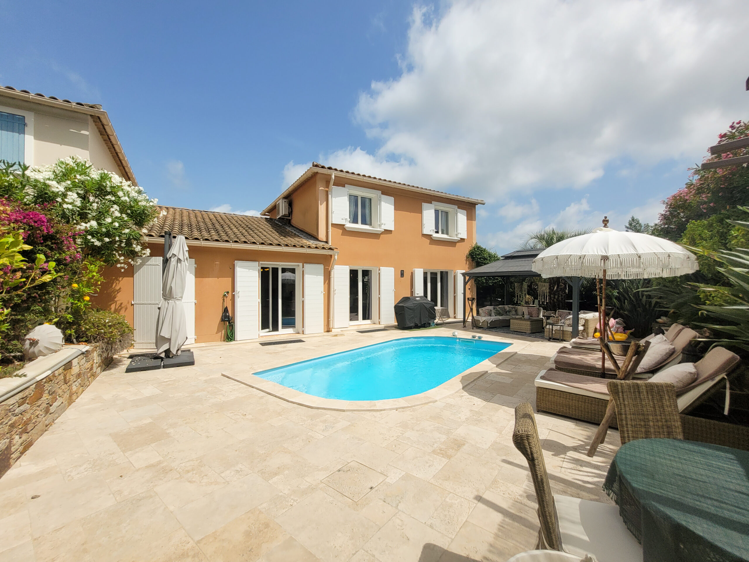 A jacuzzi with sea view completes this outdoor space, ideal for relaxing moments facing the Var coastline. The villa also benefits from access to a condominium with a swimming pool and tennis court.